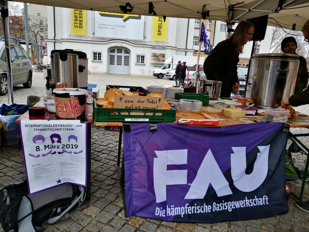Viele Menschen legten heute in Dresden ihre Lohnarbeit sowie emotionale, Sorge- und Hausarbeit nieder. Dafür haben sie sich am Morgen in sechs Streik-Cafés an unterschiedlichen Orten getroffen. Hier lag der Fokus auf einem umfassenden, branchenübergreifenden Austausch. Die Hochschule für bildende Künste startete beispielsweise mit einer Kunstaustellung „Fe*male Intervention“ und schloss durch ein Gespräch mit CindyCat über die finanzielle Unsicherheit und Diskriminierung von Künstlerinnen an. In der kosmotique ( Seit 2012 betreiben Ehrenamtliche die kosmotique in einem ehemaligen Ladenlokal in der Dresdner Neustadt als einen politischen Raum, der gemeinsam mit anderen Gruppen und Kollektiven mit Kritik und linker Praxis gefüllt wird. Regelmäßig finden in der kosmotique Vorträge, Filmvorführungen, Workshops und Tagesseminare und Treffen politischer Gruppen und Initiativen statt.) fand ein Fotoshooting statt, beit dem die Teilnehmenden darstellten, was ihre persönliche Situation im Patriarchat am besten symbolisiert.